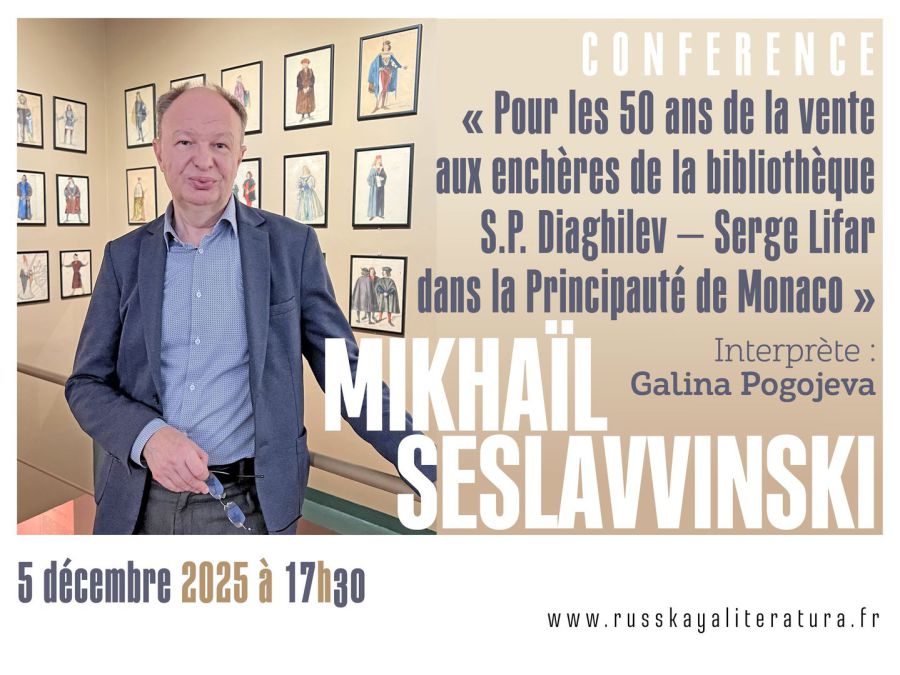 17h30. « Pour les 50 ans de la vente aux enchères de la bibliothèque S.P. Diaghilev — Serge Lifar dans la Principauté de Monaco ». Conférence donné par Mikhaïl SESLAVVINSKY, président de l'Union Nationale des Bibliophiles de Russie, chercheur de la culture livresque, membre de l'Académie russe des arts.